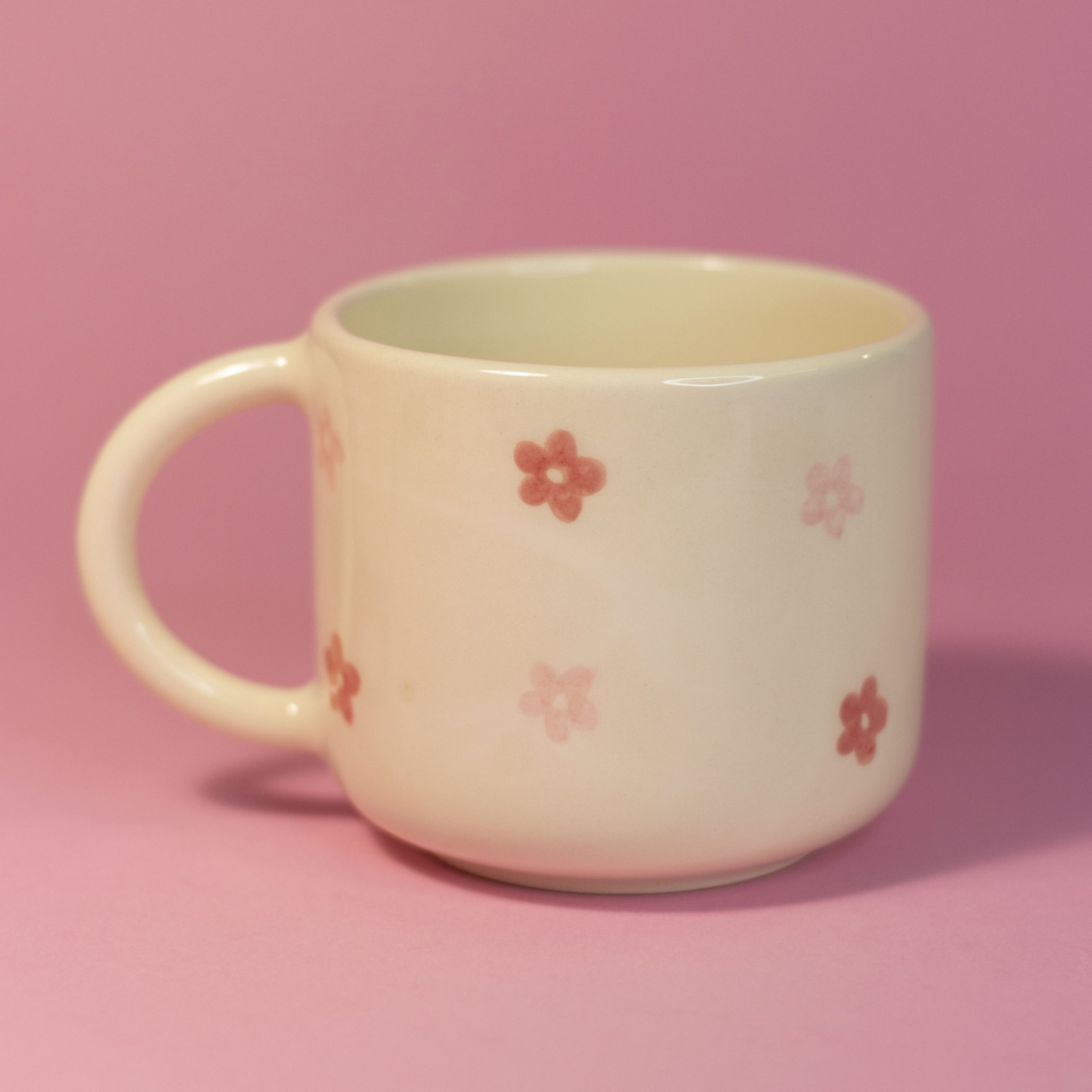 Kubek MOMMY MUG to prosty kształt z ręcznie malowanym napisem i wzorem kwaitów, które na każdym kubku układają się inaczej, a to sprawia, że naczynia są niepowtarzalne i unikatowe. Kubki idealnie sprawdzą się na kawę lub ceremonialne kakao, a pojemność 300 ml pomieści zarówno americano, jak i cappucino.